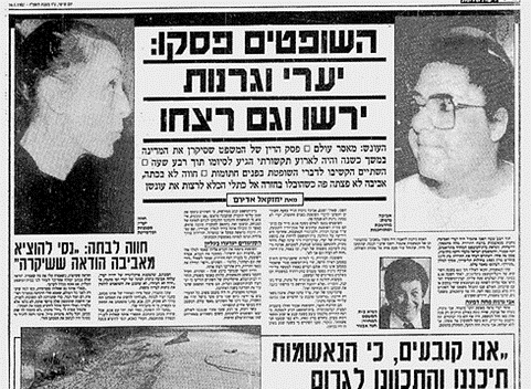 Gazete haberinde Solda Hava Yaari ve ve diğer köşede Aviva Granot mahkemenin ikisini cinayetten suçladığı haberi yer alıyor. ( Sağda Ehud Yaari)